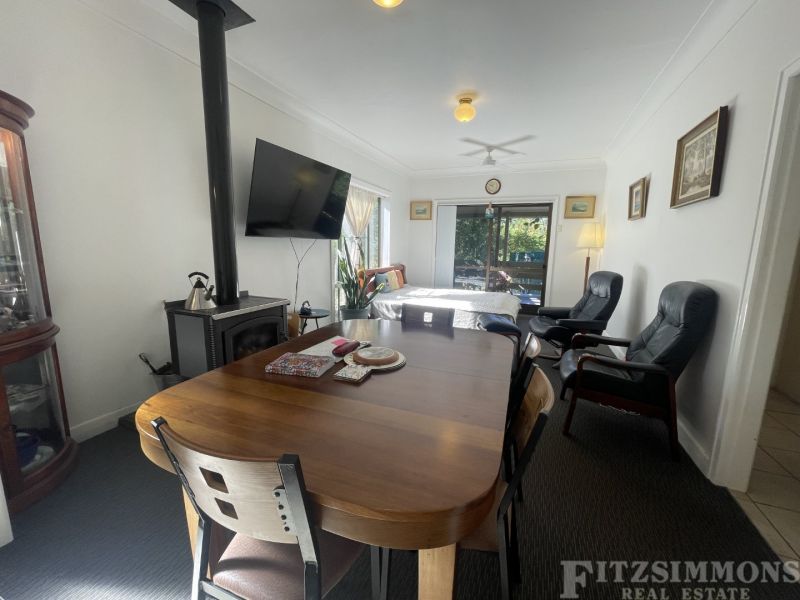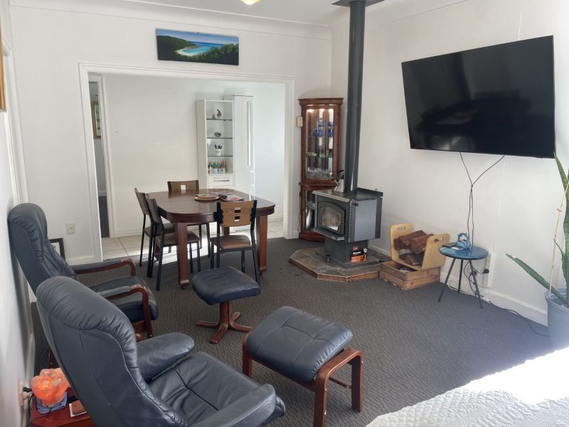 • Large open plan combined dining/lounge room with wood heater & ceiling fan.