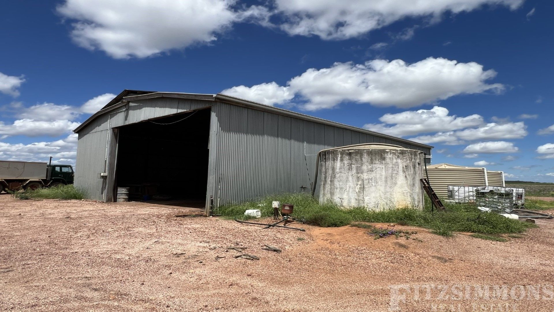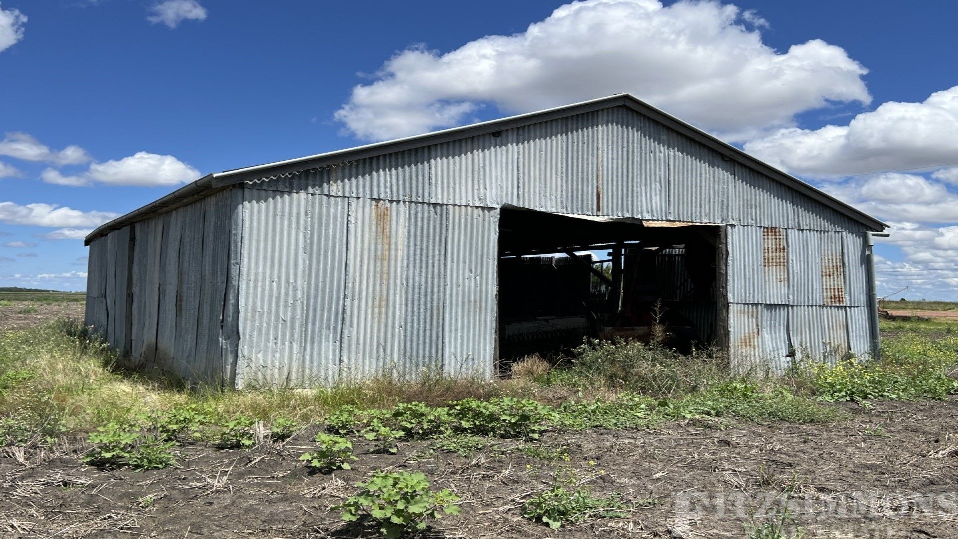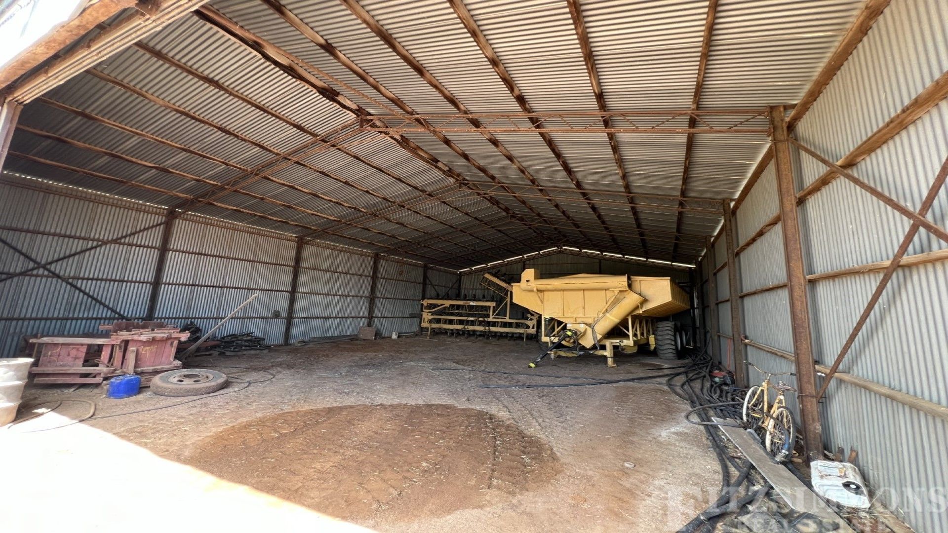 - 19m x 12.5m Machinery Shed enclosed three sides, has power connected & gravel floor.